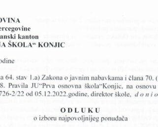 Bosna i Hercegovina Federacija Bosne i Hercegovine Hercegovačko-neretvanski kanton Grad Konjic JU "PRVA OSNOVNA ŠKOLA" KONJIC Na osnovu člana 85.Zakona o osnovnom odgoju i obrazovanju u HNK („Sl.novine HNK“ br. 5/00, 4/04, 5/04, 1/14, 7/16 i 7/22), člana 8. Kolektivnog ugovora za djelatnost osnovnog odgoja i obrazovanja u HNK (“Sl. novine HNK” broj:12/21 i 6/23), člana 13.,14. i 15.Pravilnika o radu, Saglasnosti Ministarstva obrazovanja, nauke, kulture i sporta HNK, broj: 02-30-2086/25 od 11.11.2025.godine, raspisuje se K