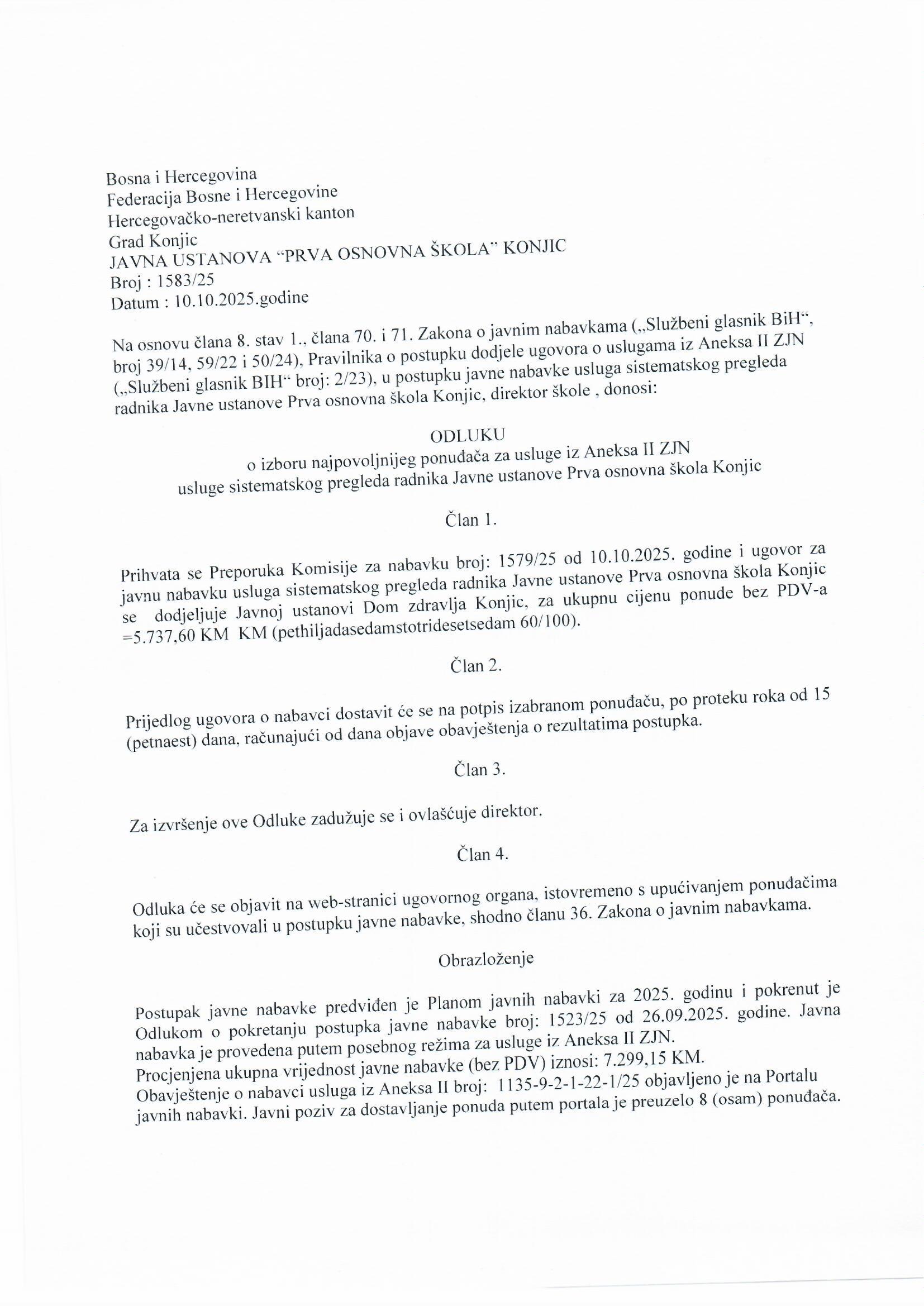 Na osnovu odredbi Zakona o javnim nabavkama i Pravilnika o postupku dodjele ugovora za usluge iz Aneksa II ZJN, direktor Javne ustanove Prva osnovna škola Konjic donosi Odluku o izboru najpovoljnijeg ponuđača za uslugu sistematskog pregleda radnika.