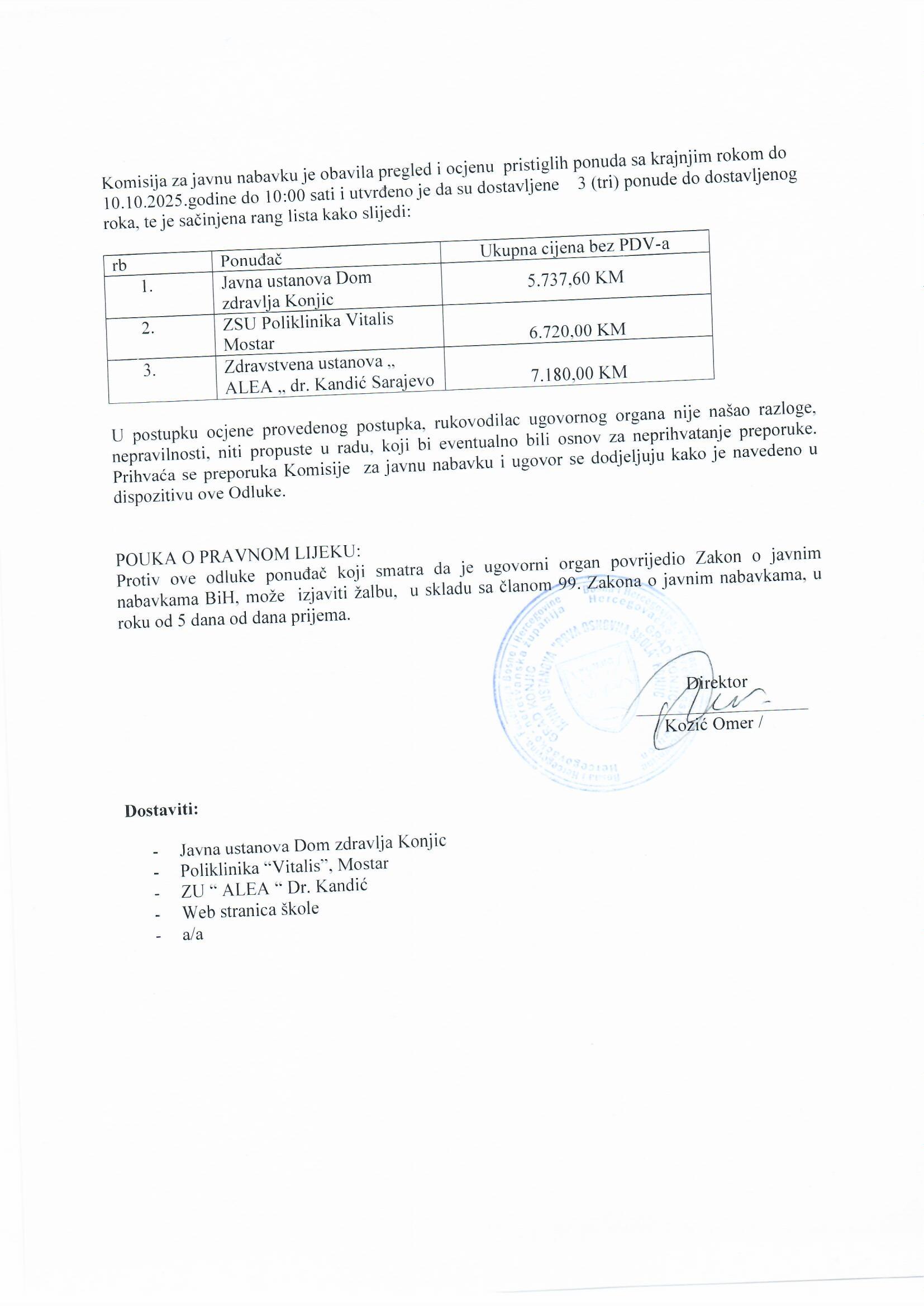 Prihvaća se Preporuka Komisije za nabavku broj 1579/25 od 10.10.2025., te se ugovor za javnu nabavku usluga sistematskog pregleda radnika dodjeljuje Javnoj ustanovi Dom zdravlja Konjic za ukupnu cijenu ponude bez PDV-a: 5.737,60 KM (pet hiljada sedamsto trideset sedam i 60/100 KM).